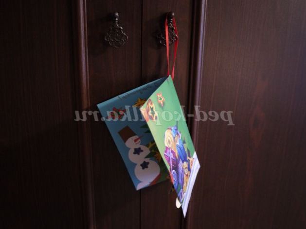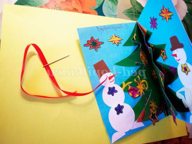 14. Ну, і останнє, Ми прив'язали до нашої листівці шовкову стрічку, тепер нашу листівку можна повісити на справжню ялинку!!!