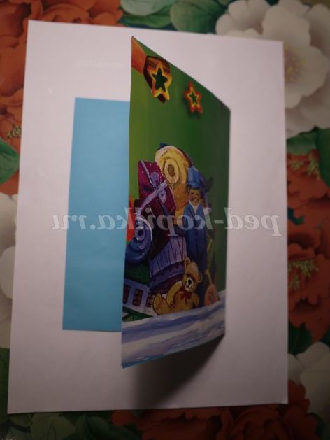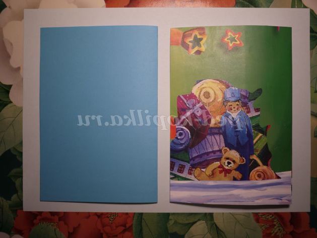 5. Потім склеюємо дві частини листівки: на зовнішню частину (вирізану з подарункового пакета) наклеюємо внутрішню (вирізану з кольорового блакитного паперу).