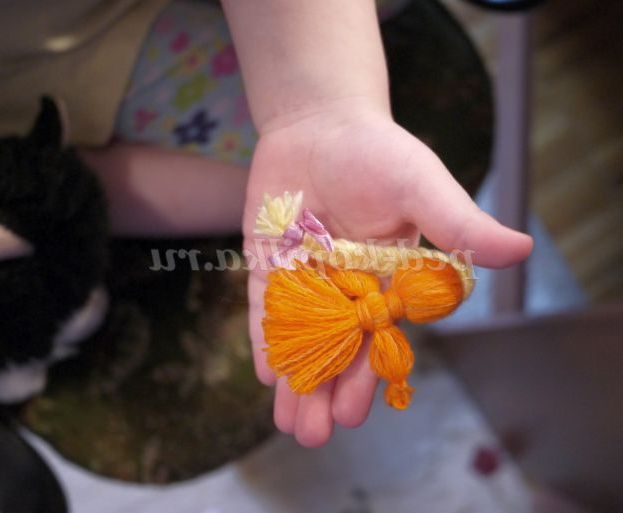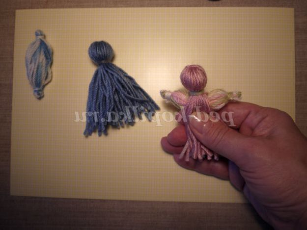 8. Далі, намічаємо лялечці талію і перев'язуємо ниткою, закріплюємо. Оформляємо нитяную спідничку (рівняємо спідничку ножицями).Мартиничка - дівчинка готова.