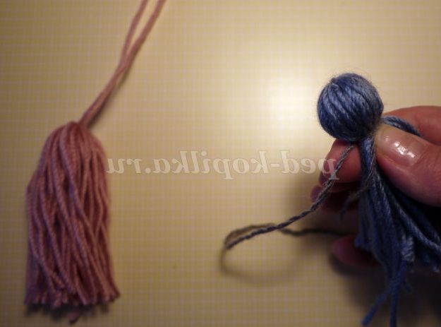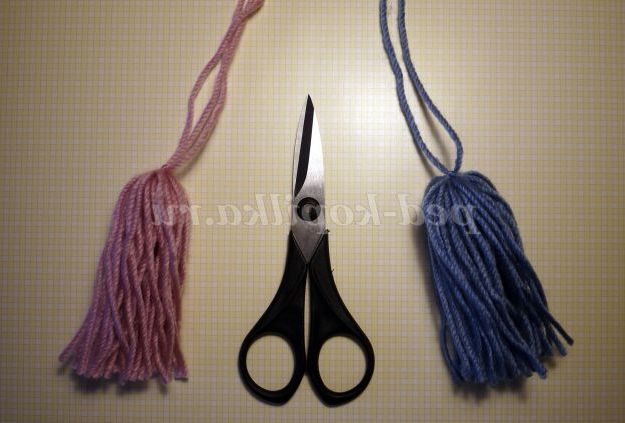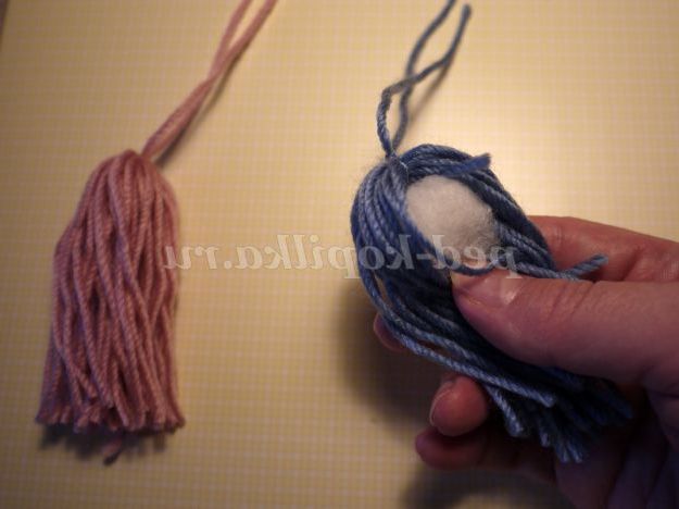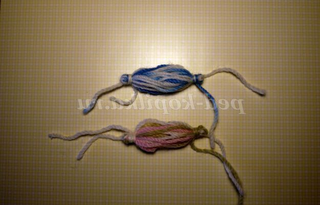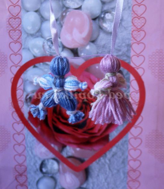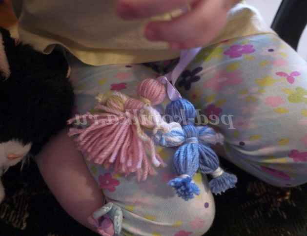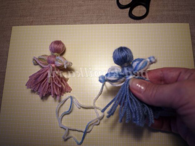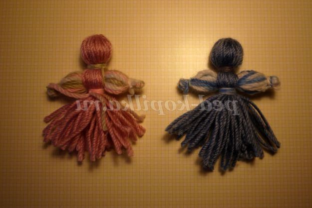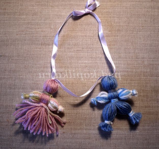 10. Потім з двох ниток різного кольору робимо кручений шнурок, або використовуємо атласну стрічку і на його кінці прив'язуємо лялечок.