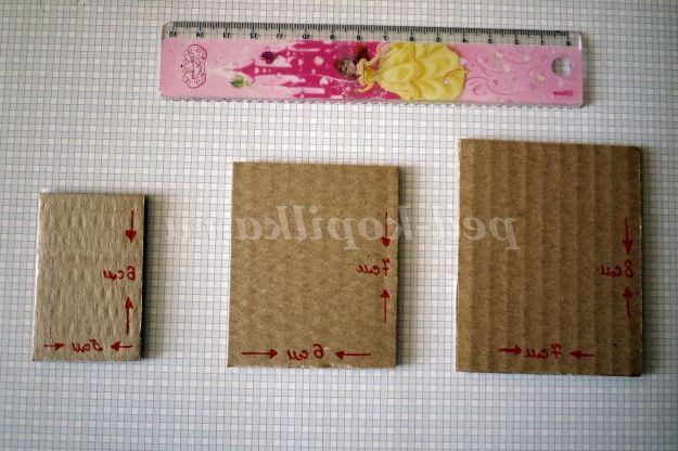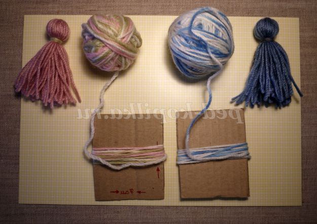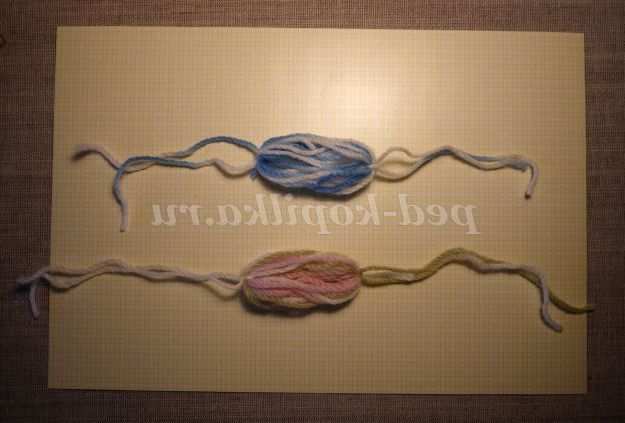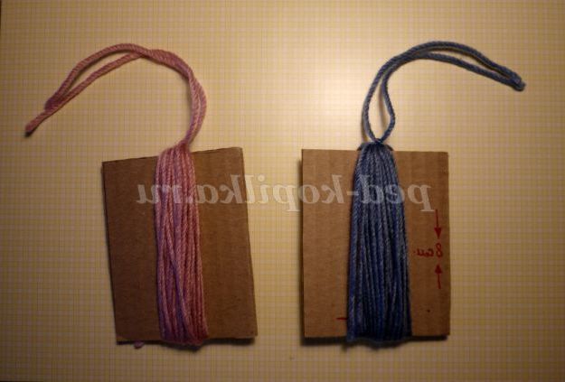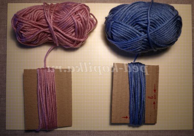 Другий етап: виготовлення ручок. Намотуємо нитки на картонний шаблон по вузькій стороні (7 см), розрізаємо з двох сторін.