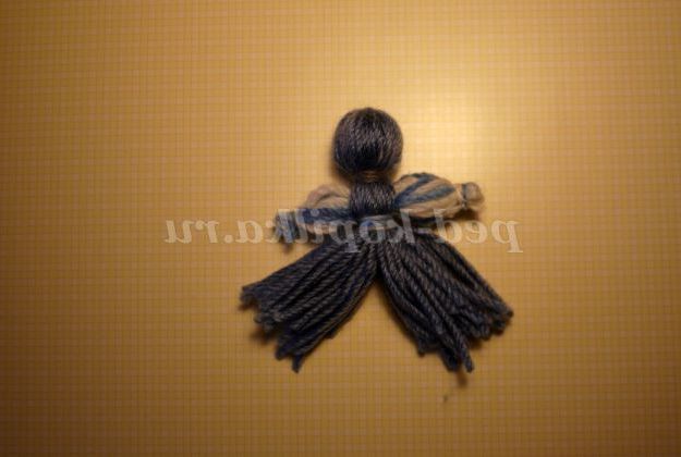9. Тепер працюємо з другої лялькою - це буде хлопчик. Для цього нитяную спідничку ділимо навпіл, внизу пучки ниток пряжі обв'язуємо, як і ручки, так вийшли ніжки.