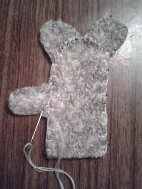 2. Починаємо зшивати голкою нашого персонажа. Використовуємо шов «Обметування через край». Спочатку зшиваємо тулуб. Далі пришиваємо вушка, лапки і хвостик.