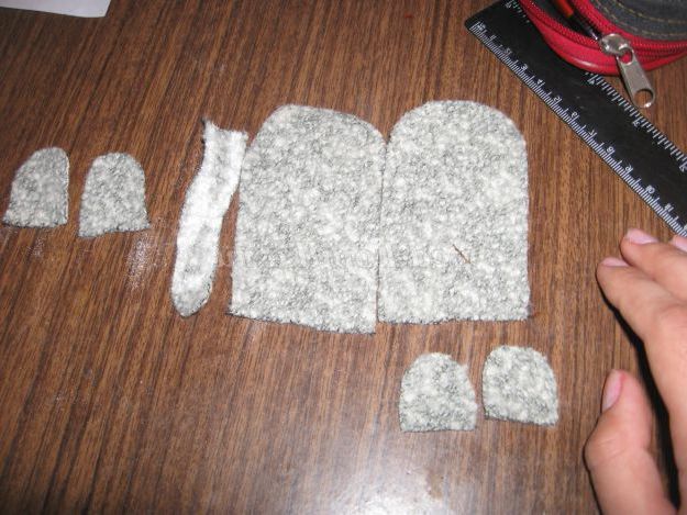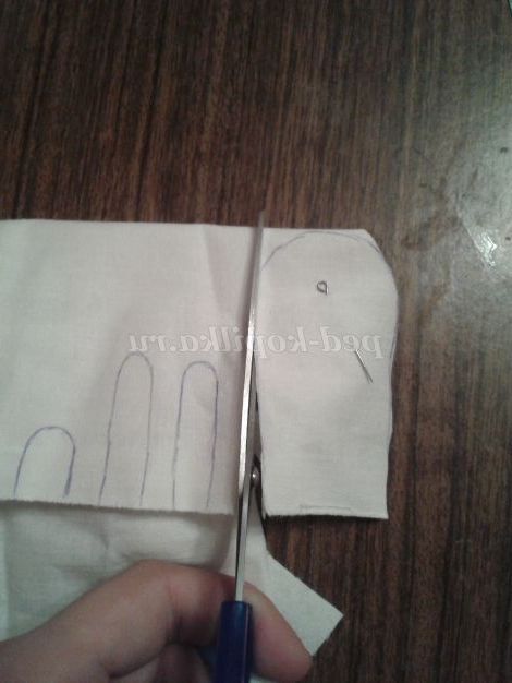 1. Вибираємо тканину для першого казкового героя - Мишки - норушки.Рисуем на тканини основні деталі( тулуб 2 дет., вушка 2 дет., лапки 2 дет., хвостик) і викроюємо.