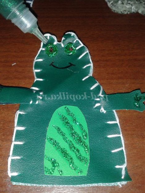 9.Дорисовываем чорною ручкою очі - крапочки, вуса - зайчику і жабі - ротик. Далі з допомогою клею з блискітками розмальовуємо наших персонажів, щоб вони були яскравими і блискучими.
