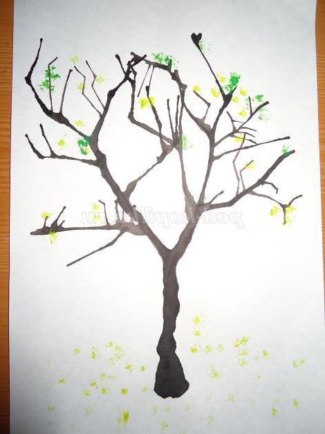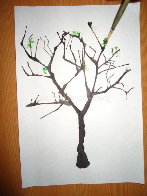 8.Тушь досить швидко висихає, тому через 1-2 хвилини можна приступати до зображення листя. Занурюємо палець у воду і капаємо краплю у фарбу зеленого кольору. Чекаємо на 10-15 секунд, щоб вода вбралася у фарбу. Вмочуємо суху кисть у фарбу і малюємо листя на дереві, притискаючи пензель вертикально щільно до листу.