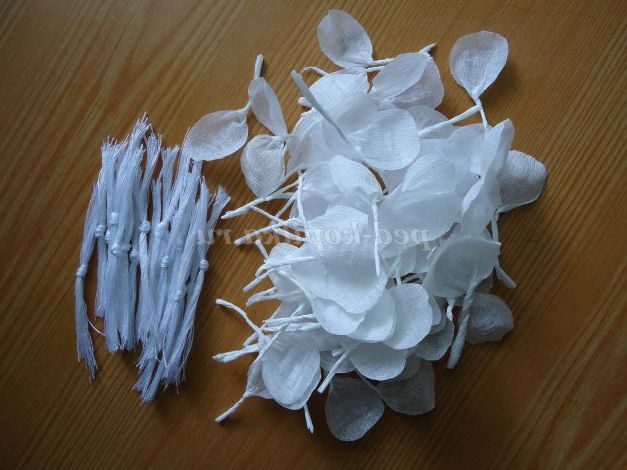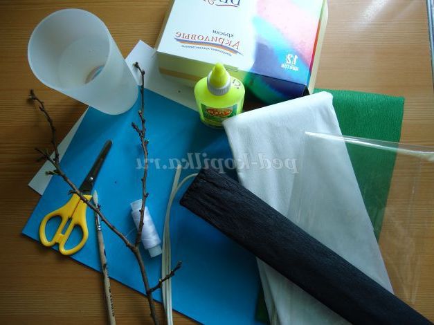 Матеріали: сливова гілочка, крепований папір, акрилові фарби, пензлик, склянка з водою, целофан, клей, нитки, голка, ножиці, шнур, два листа картонного паперу - білий і блакитний.