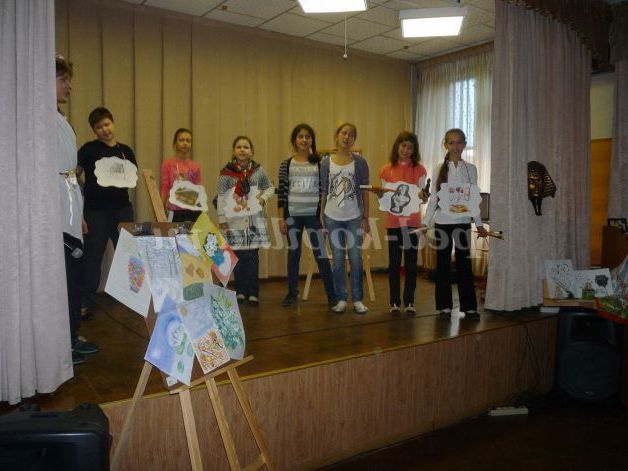 Поруч зі сценою організована виставка робіт хлопців, зроблених протягом декількох занять теми «Види мистецтва». Шиття, графіка, батік, скульптурні вироби і вишивка, вітраж і багато іншого.