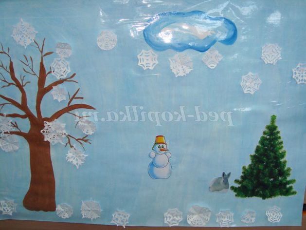 (В групу входить Маша вітається з дітьми, розглядає групу, зауважує зимову картину, де на блакитному тлі зображено ялина, липа, хмаринка, сніжинки.