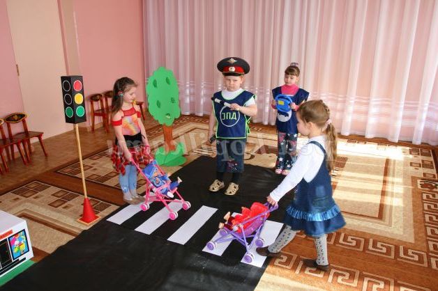 2. «Екскурсія до світлофора». Дитина бере на себе роль вихователя. За ним йде група дітей. На перехресті біля світлофора дитина - вихователь запитує, як правильно переходити дорогу. Діти відповідають. Дитина - вихователь постає посередині дороги і піднімає червоний прапорець, діти переходять дорогу.