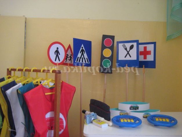 Атрибути для гри: костюми «Транспорт», «Співробітник ДПС», «Міліціонер», регулювальний жезл, рулі, переносні дорожні знаки, світлофор, полотно «Пішохідний перехід», прапорці для переходу вулиці, макети будівель і дерев, макет автозаправної станції (АЗС): бензоколонка, каністра, каса, макет автомайстерні: інструменти, відро з щіткою, насос, коляски і ляльки, іграшки - машини «Види транспорту», гаманці, гроші, квитки для проїзду в громадському транспорті, маски наголовники із зображенням машин.