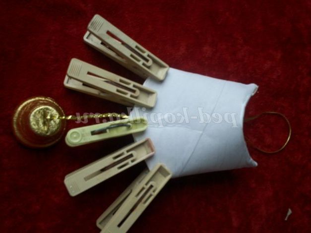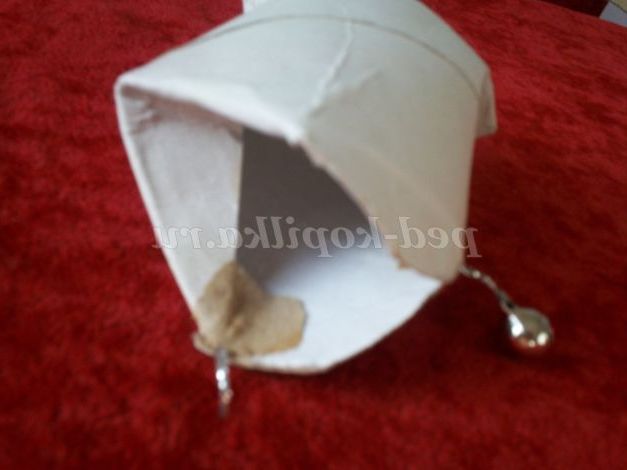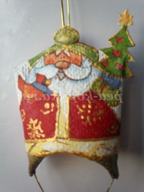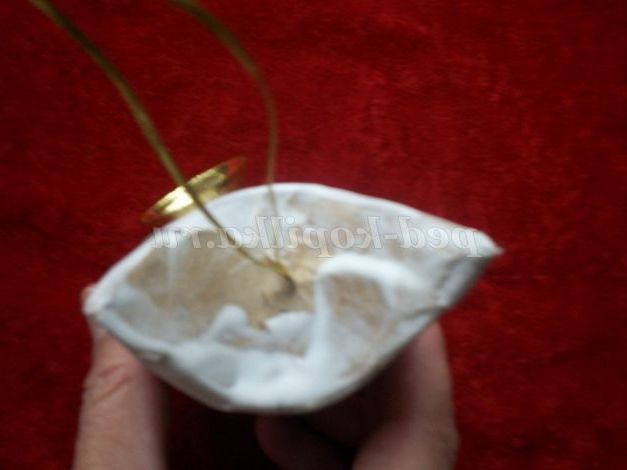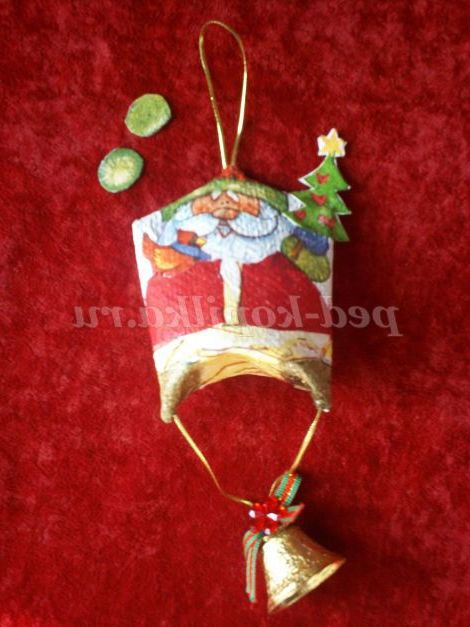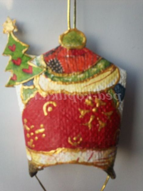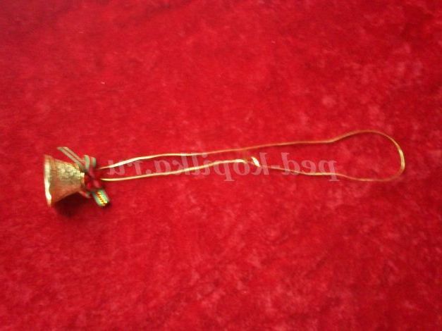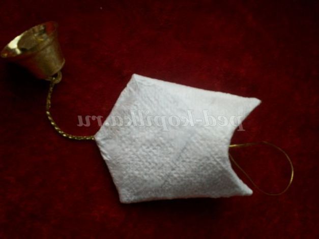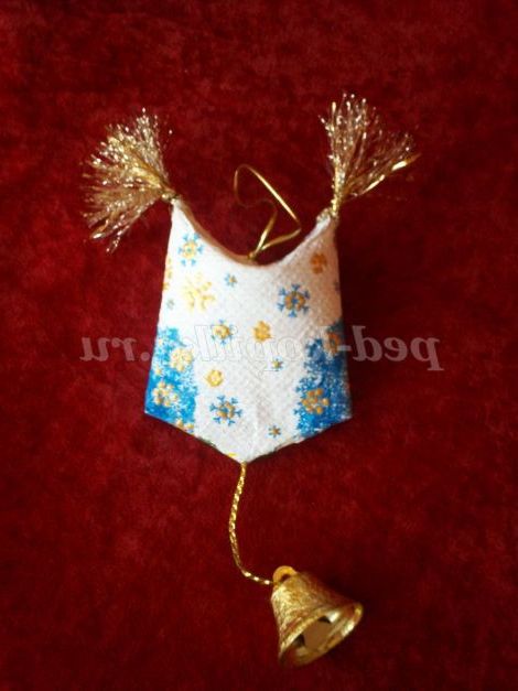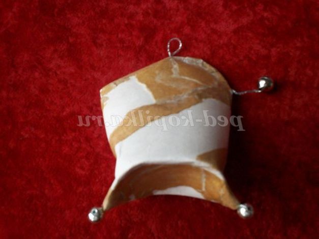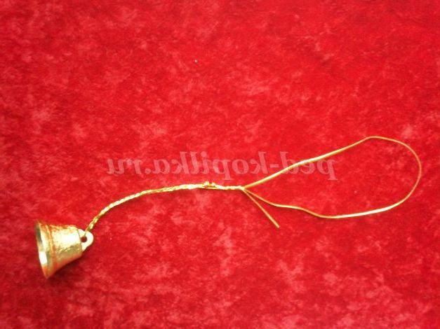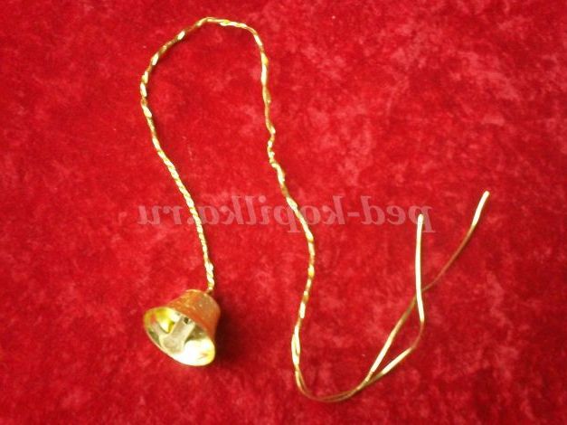 15. Коли лак висохне (не прилипає до рук) прив'язуємо золоті стрічки до колокольчику і до петельці. Робимо бантики.