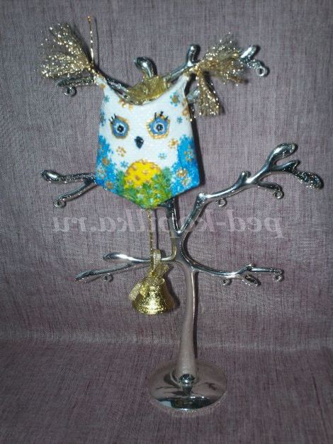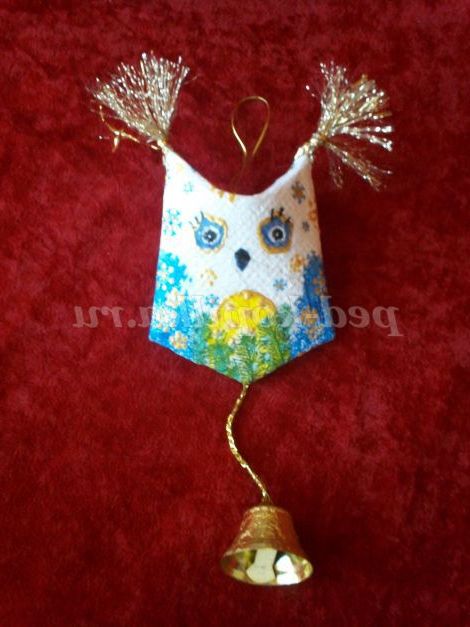 8. Зав'язуємо хвостик (кілька золотих ниток для в'язання 25 см) аналогічно вушках сови і контуром «Золото» малюємо смужки, крапочки. Зав'язуємо бантики з однієї й іншої сторони петельки.