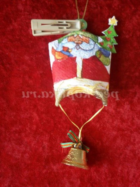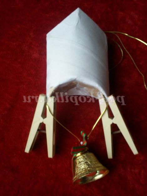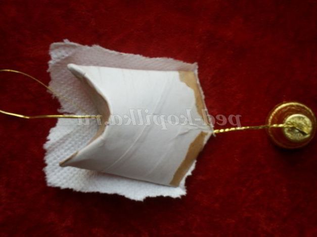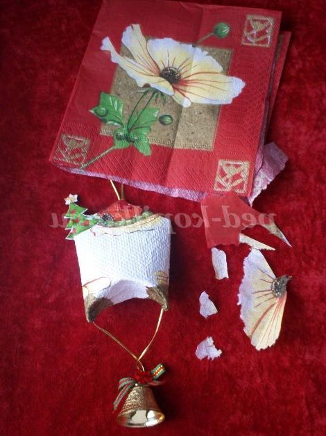Обладнання: картонні рулончики від туалетного паперу, клей ПВА, ножиці, лінійка, дзвіночок, нитка позолочена, прищіпки 5 шт., серветка біла, серветка з новорічним малюнком, пензлик, голка, акрилові фарби, акриловий лак, контур «Золото», кольорові камінці, золота стрічка.