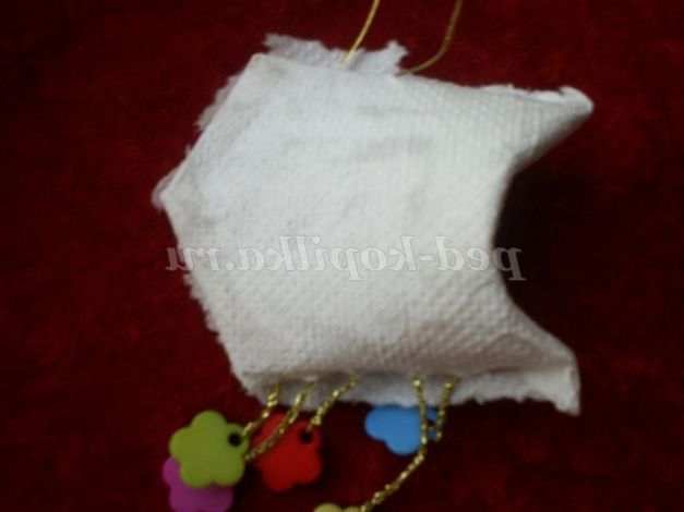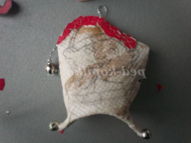 12. Залишаємо заготівлю сохнути на 1-2 години. Після повного висихання робимо пензлика на вушках. Для цього беремо 15 см золотої нитки для в'язання. З допомогою голки протягуємо нитку наполовину (7,5 см) і зав'язуємо вузол на вушку. Потім нитку зав'язуємо двічі вузлом навколо вушка. Расплетаем нитка. Підрізаємо, вирівнюємо краю.