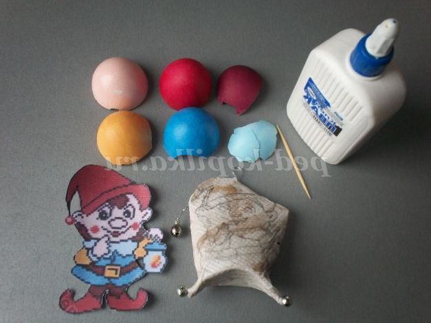 5. Обклеюємо серветкою, розчином (клей-вода). Коли висохне заготівля, ми малюємо гнома. Робимо проколи голкою для розміщення нитки з конячкою.
