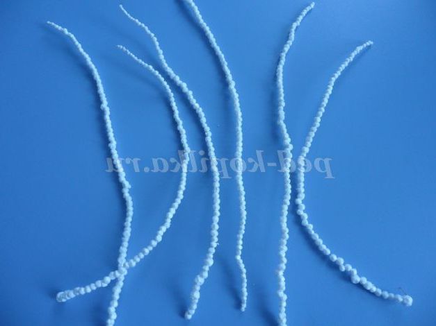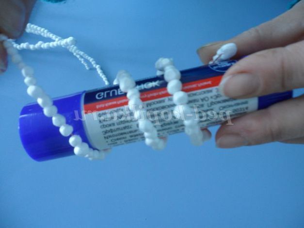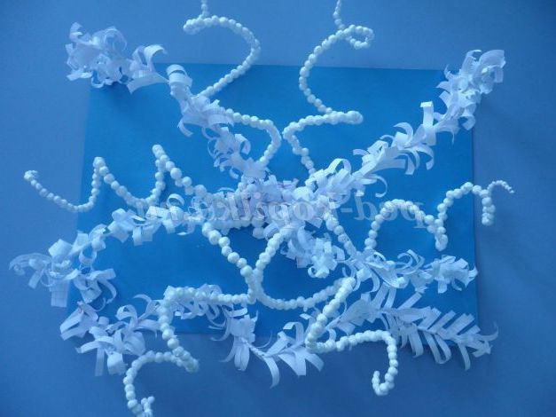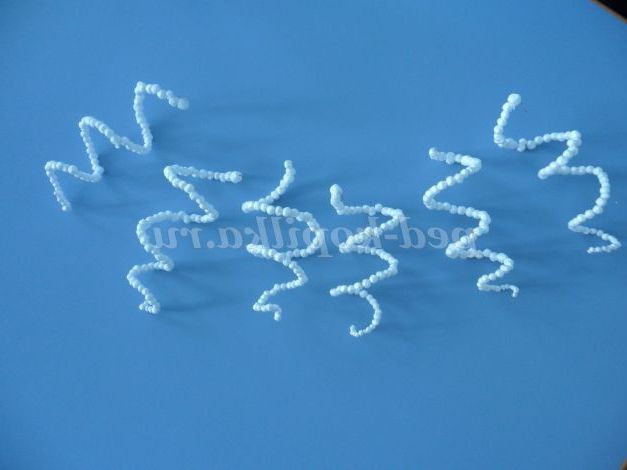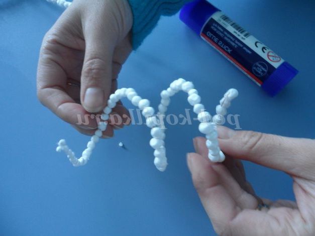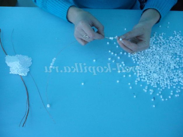 Беремо один шматочок дроту і нанизуємо на неї кульки пінопласту, попередньо загнувши кінець, щоб кульки не скочувалися з неї. Вибираємо спочатку великі кульки, а потім все менше і менше. Коли заповнили всю дротик, потрібно загнути другий її кінець. У нас готові гілочки в інеї
