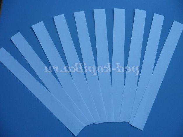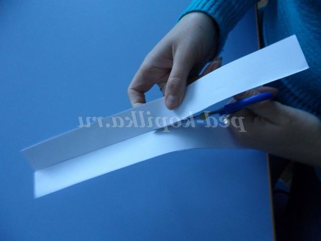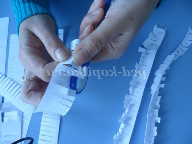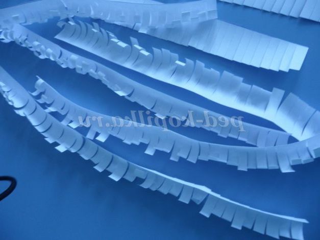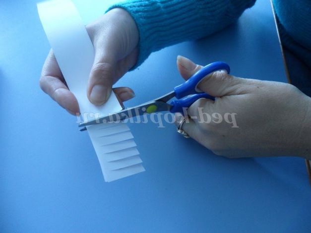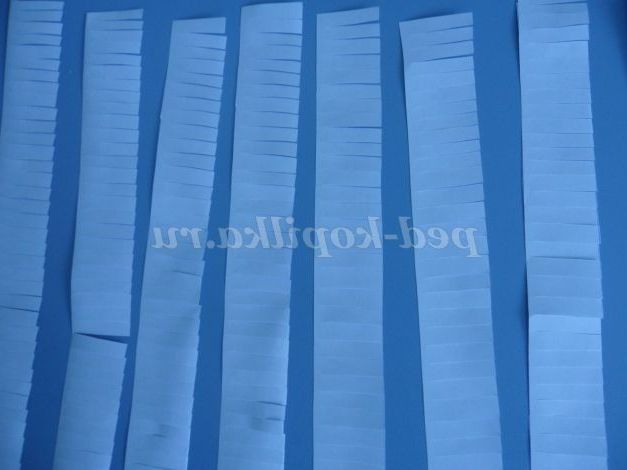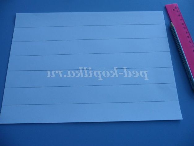 Тепер расчерчиваем смужками по всій довжині шириною 3 див аркуші білого паперу і розрізаємо їх. (можна зробити кілька штук з зошитових листів, у них є блакитний відтінок)