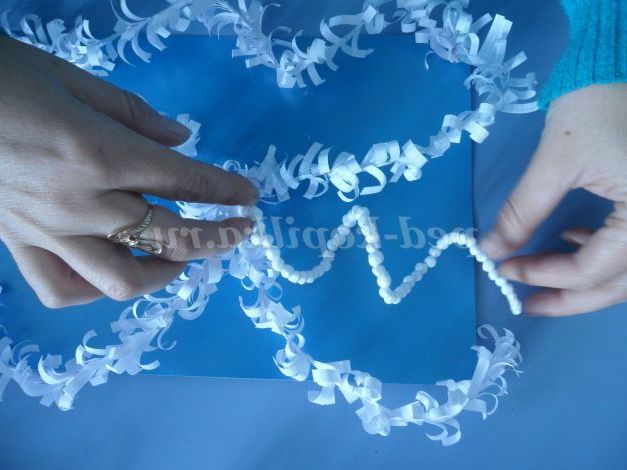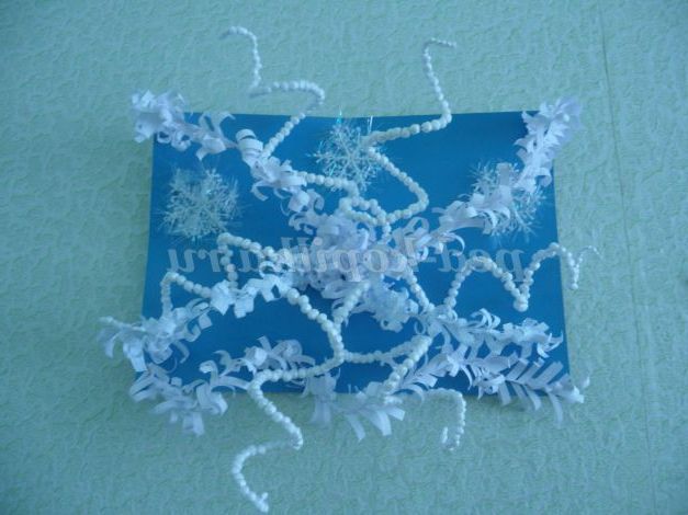 На порожніх місцях, де проглядає картон, приклеюємо невеликі пухнасті сніжинки.