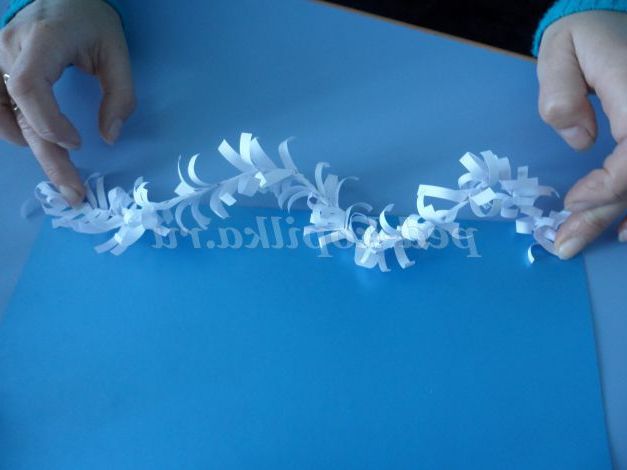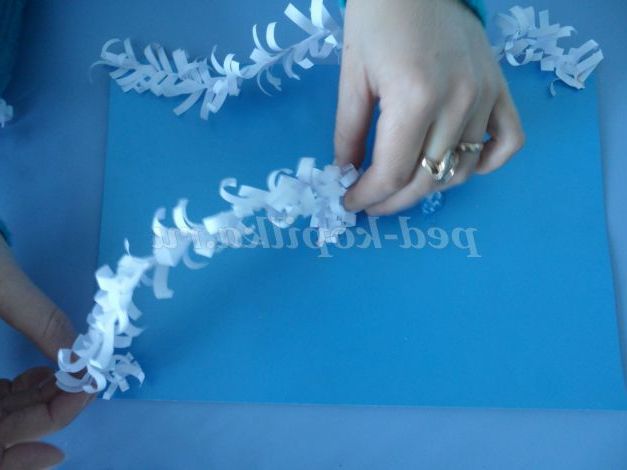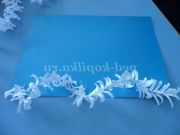 Починаємо оформляти наше панно! У нижнього підстави листа приклеюємо саму довгу снігову гілочку, трохи закрутивши її, щоб вона помістилася на аркуші картону.