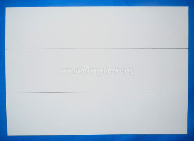 Аркуш білого картону або альбомний аркуш, розділити на три смуги, ширина кожної дорівнює 7 см Для дітей, які ще не вміють працювати з лінійкою, можна приготувати шаблон-смужку.