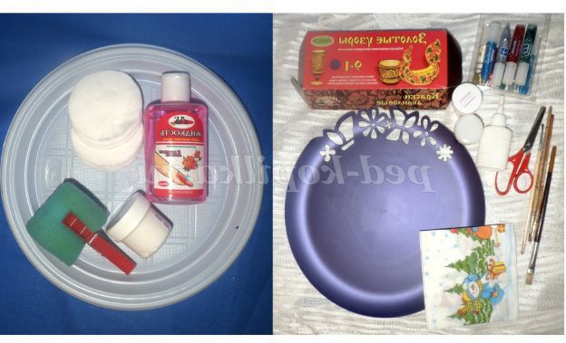 Пластикова тарілка; серветки з тематичним малюнком; засіб для знежирення (рідина для зняття лаку); біла акрилова фарба; клей ПВА; пензлі різної товщини; кольорові акрилові фарби; акриловий лак; кольоровий гель з блискітками; ножиці; спонж з губки