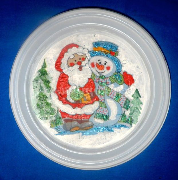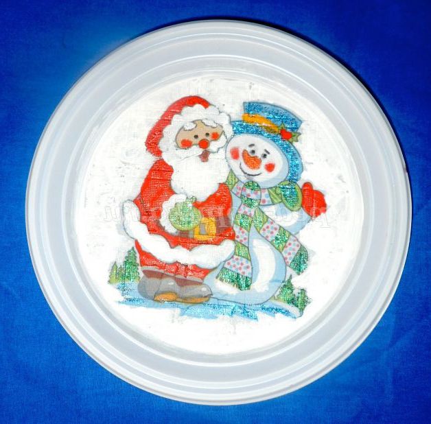 5. Змащуємо тарілочку клеєм ПВА, розведеним з водою(1:1) і приклеюємо картинки.