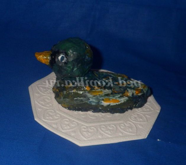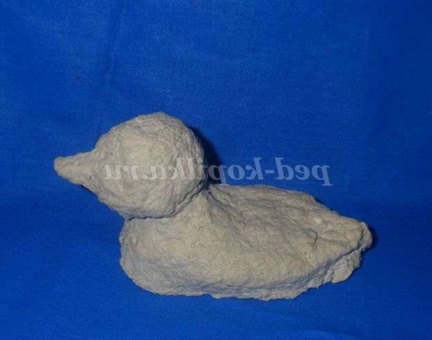 Можна через сито зцідити зайву воду. Додаємо клей ПВА і ретельно перемішуємо. З отриманого тіста ліпимо качечку. Надаємо качечка форму голови, дзьобик, хвіст. Нашу крижня викладаємо на просушку в природних умовах на добу.