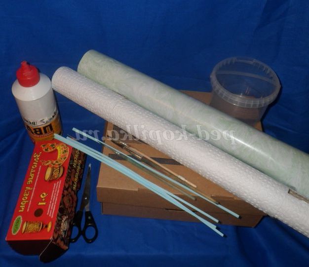 коробка, шпалери, самоклеюча папір, клей ПВА, ножиці, акрилові фарби, пензлики, паперовий лоток від яєць або серветки або паперові рушники для приготування паперової маси .