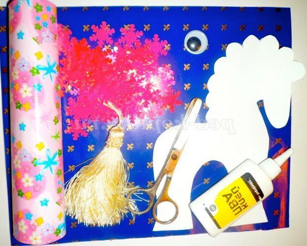 Для роботи нам знадобиться : пакувальна папір (світла і темна ) за розміром більше альбомного аркуша, альбомний аркуш А-4, шаблон конячки, ножиці, клей ПВА, паєтки, пензлик з ниток( теж непридатний матеріал).