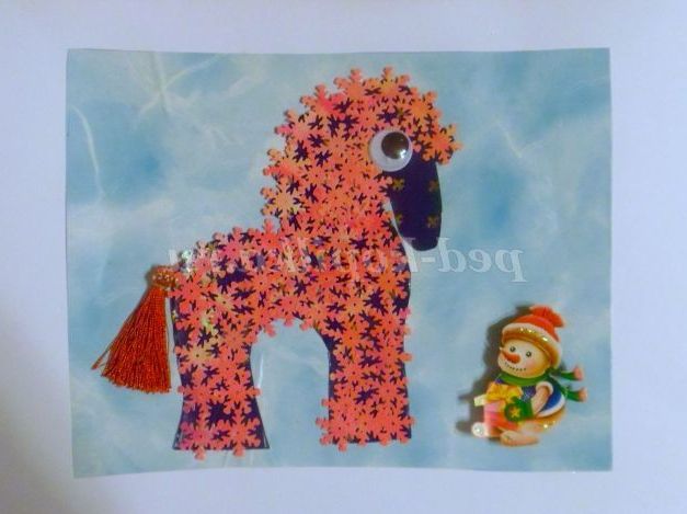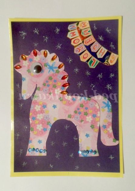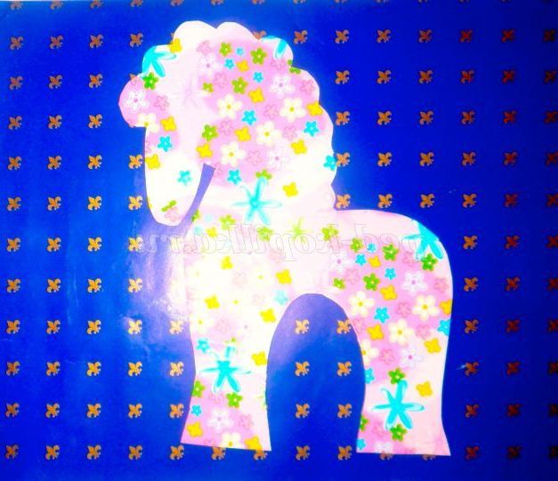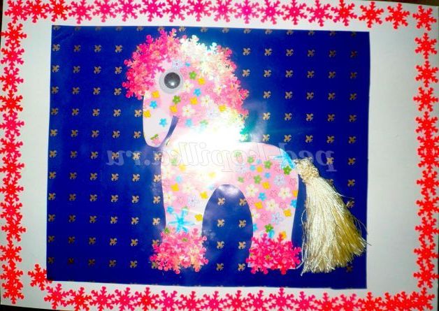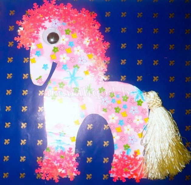 3. Наклеюємо конячку на середину аркуша, не забуваючи, приклеїти хвостик. Для хвостика можуть бути різні варіанти: папір, дощик, пряжа. В нашій виробі хвостиком послужить пензлик з ниток