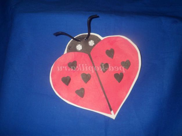 9. Виріб наклеюємо на білий картон і вирізаємо Божу корівку по контуру плюс 5 мм білого картона.Раскрашиваем очі Божої корівки.
