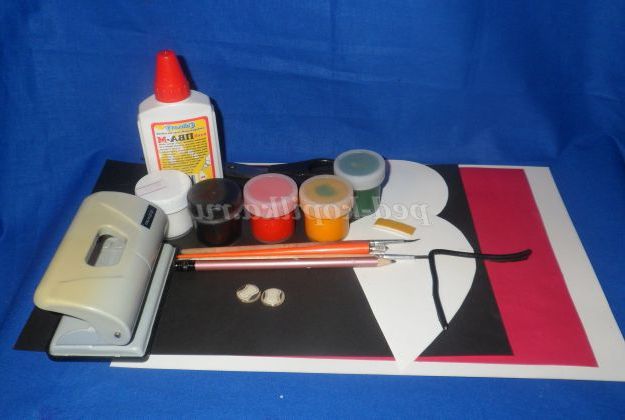 Необхідний матеріал: кольоровий картон білого, червоного і чорного кольору, ножиці, клей ПВА, два гудзики, двосторонній скотч для приклеювання гудзиків, дирокол, дріт чорного кольору, чорна пряжа, гуаш, пензлики, шаблони, олівець, ручка для гравюри.
