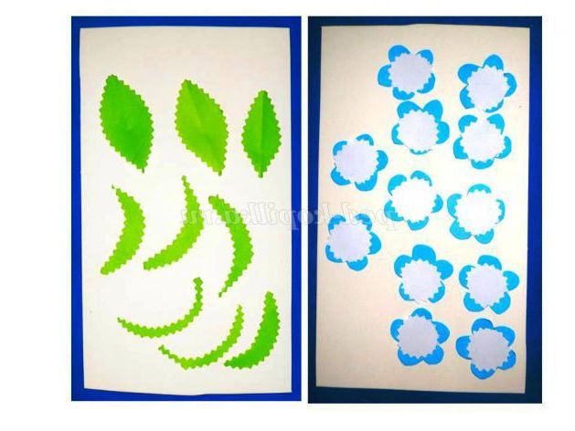 3. Фігурними ножицями вирізати з білого паперу кружечки для серединки цветка.Сложить навпіл зелений лист і вирізати довільні листочки. Якщо немає фігурних ножиць, то можна використовувати звичайні ножиці і вирізати "зубчиками"