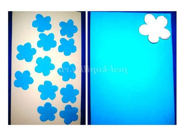 2. Скласти в кілька разів синій аркуш і за шаблоном вирізати квіточки.