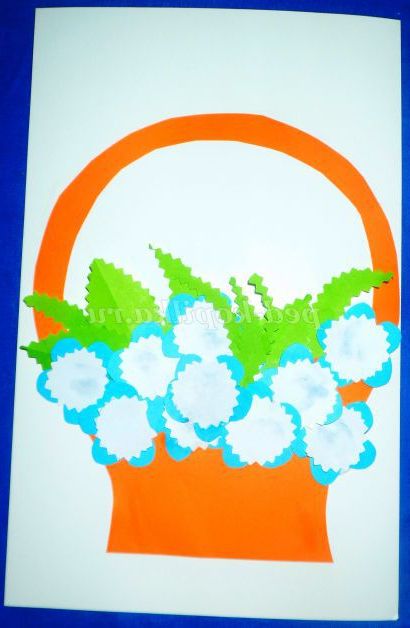 5. Наклеїти кошик на білий картон. Розташувати листя і квіти на кошику. Все акуратно наклеїти на кошик.