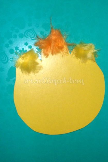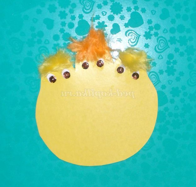 5. З синтетичного волокна або жовтих ниток створюємо "зачіски" курчатам