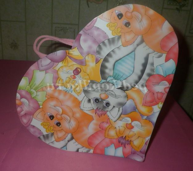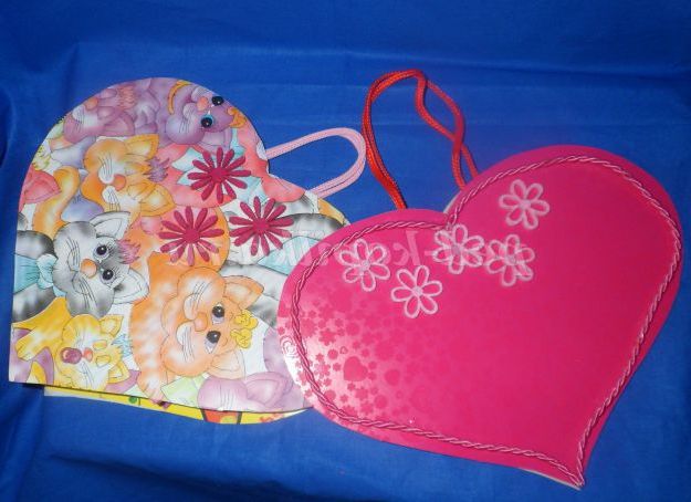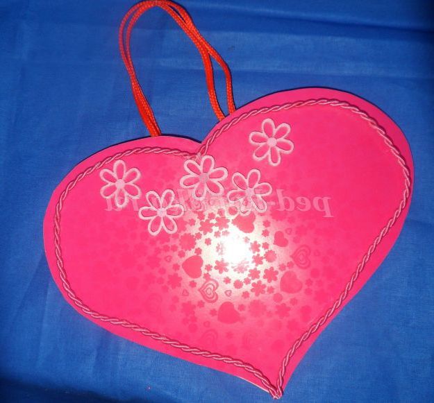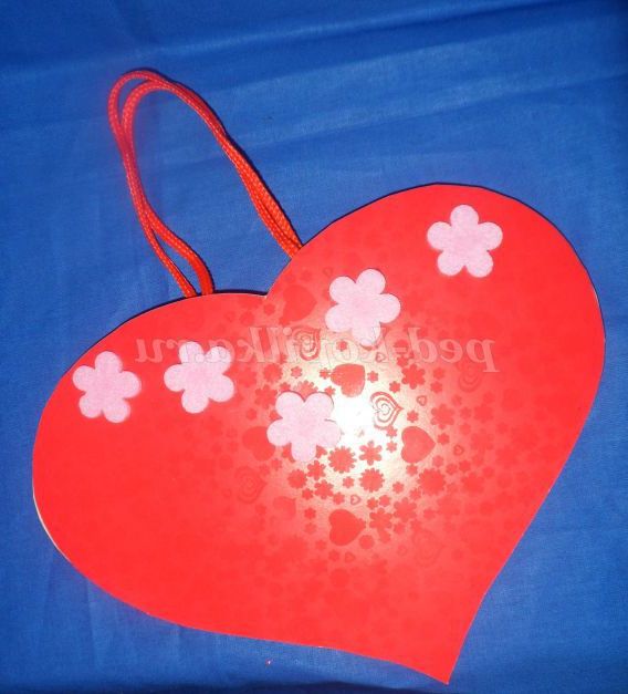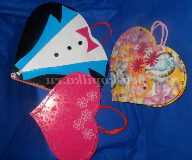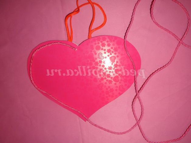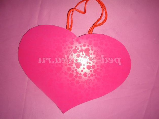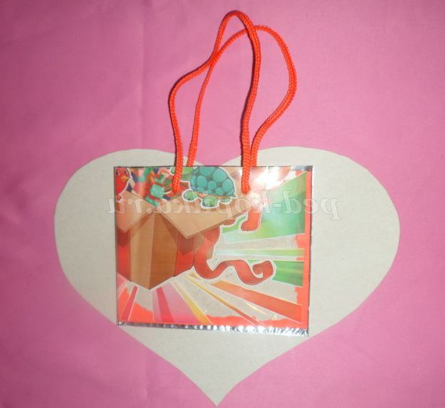 Вирізаємо з рожевого і червоного картону сердечки.Подарочный пакет наклеюємо на виворітну сторону сердечка.