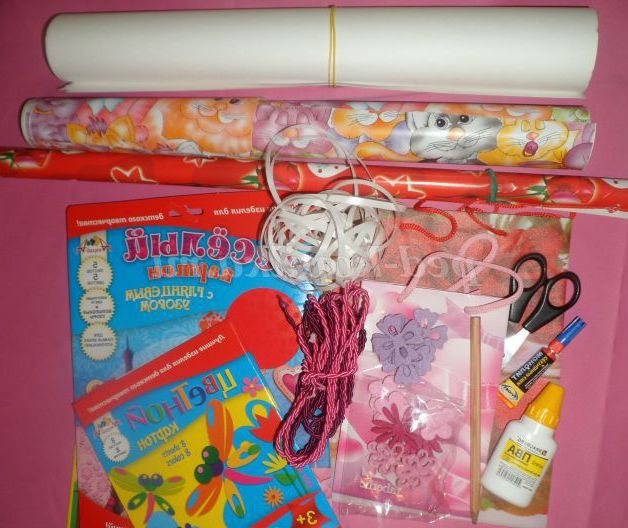 подарунковий пакет (б/у), кольоровий папір, кольоровий картон, самоклеюча плівка, ножиці, клей ПВА, моментальний клей для приклеювання декоративного шнура, прикраса з фетру.