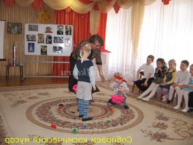 На підлозі розкидані картонні фігурки, пожмакані папірці, дрібні іграшки. По команді під музику діти c зав'язаними очима збирають «космічне сміття» в кошики. Виграє той, хто збере більше.