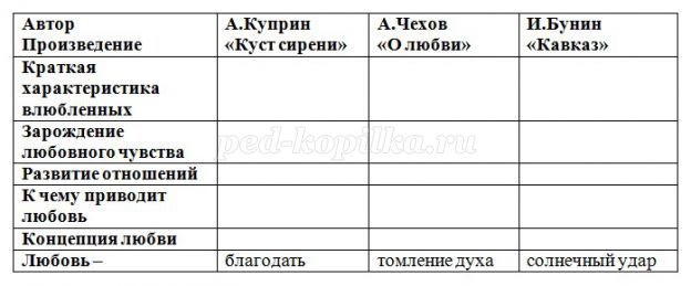 Конспект уроку по літературі: Концепція любові у творчості письменників кінця XIX - початку XX ст.(на прикладі оповідань І. Буніна, А. Чехова і А. Купріна)".