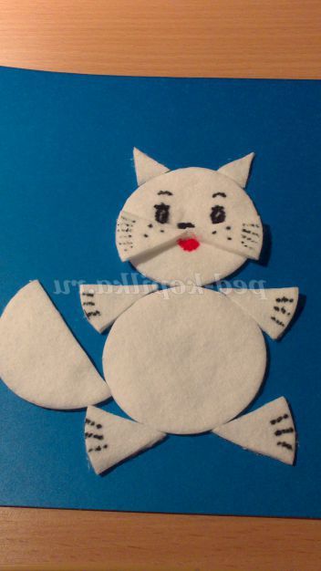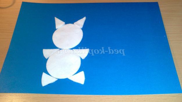 5. Потім приклеюємо передні і задні лапки. Приклеюємо половинку ватного диска - це хвіст.
