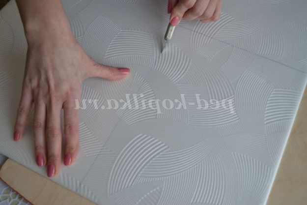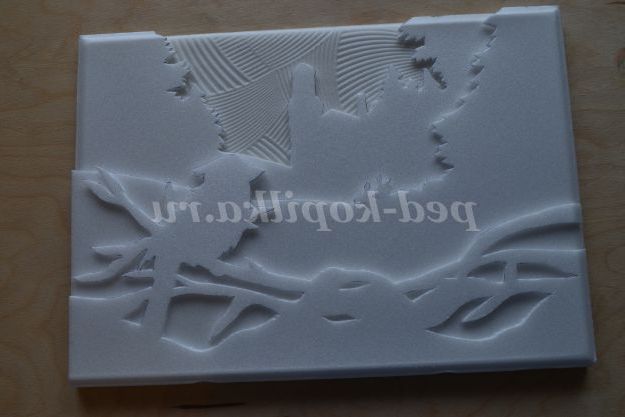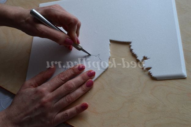 Тепер кладемо плитку на дерев'яну дошку або на лист картону (щоб не зіпсувати стіл) і акуратно вирізаємо. Не треба сильно тиснути на різак. Щоб знайти потрібний натиск, потренуйтеся на шматочку пінопласту, відчуйте матеріал.