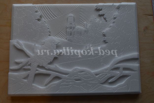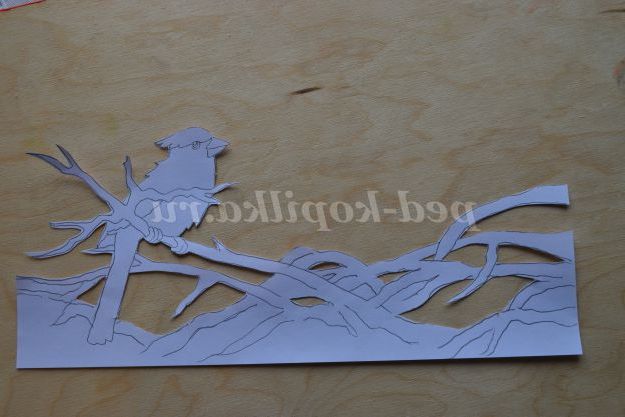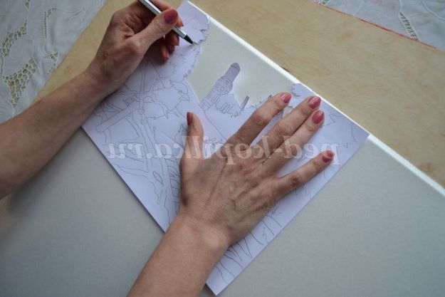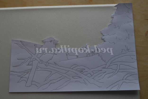 Вирізану основу відкладаємо в сторону і беремо в руки ножиці, прийшла черга середнього плану, тому на картинці ми відрізаємо небо, знову прикладаємо картинку до плитки і обводимо її, але вже без неба.