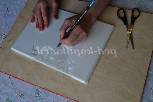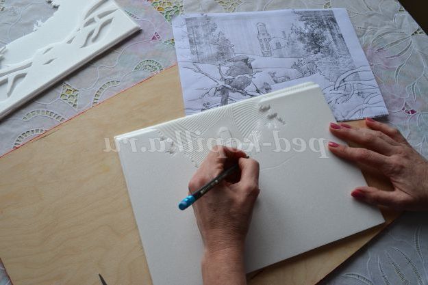 Тепер, коли сюжет готовий, можна приступати до роботи і перше, що ми робимо, вирізаємо основу панно (це задній план, на якому буде зимове небо). Для цього ми просто прикладаємо лист А-4 на кут плитки і вимальовуємо ручкою дві сторони (малювати потрібно саме ручкою, так як вона залишає чіткий, добре видимий слід).