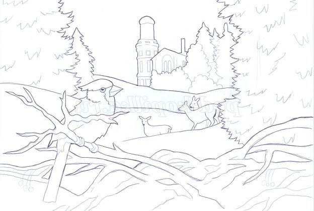 Всі форми повинні бути більш спрощеними, стилізованими, тому обрану картинку допрацьовуємо олівцем, зводимо до мінімуму всі дрібні деталі й одночасно визначаємо, що буде на передньому плані, на середньому, а що на задньому. Щоб було краще видно, контур можна посилити фломастером.