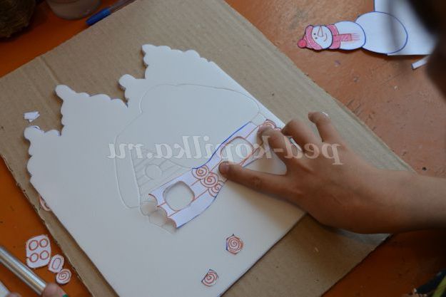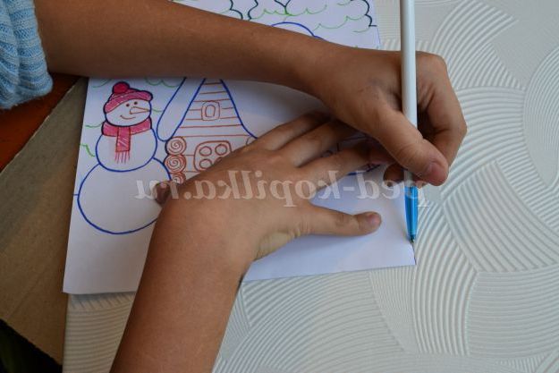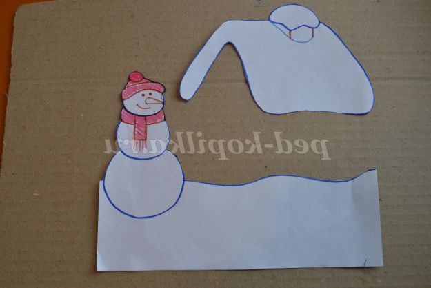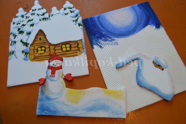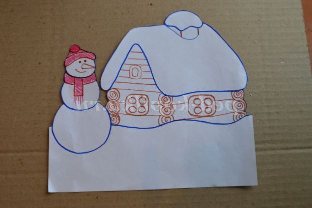 Розфарбовувати краще поки деталі не приклеєні. Спочатку розфарбовуємо небо, можна намалювати яскраву місяць і круги, що розходяться від сильного морозу, потім розфарбовуємо хатинку, шапочку і шарфик сніговикові. Сніг зверху висвітлюється яскравим місяцем, тому ми лише злегка тонуємо блакитним там, де повинна бути тінь, біля ялинок малюємо зелені голки. Додаємо падаючий від віконець світло. Останнім штрихом можна додати блискіток на снігу