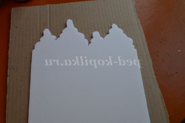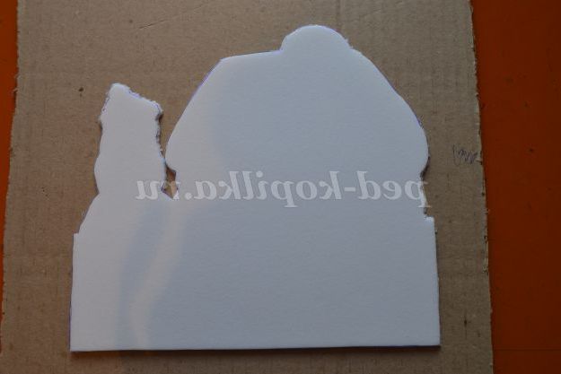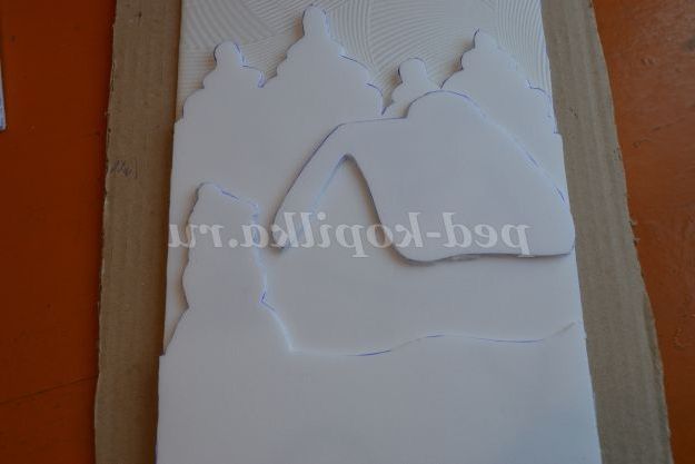 Так як небо буде на задньому плані, яке вже вирізано, ми беремо трафарет і ножицями вирізаємо ялинки, тим самим видаляючи небо. Малюємо отриману картинку на пінопласті.