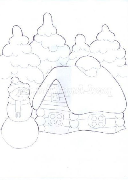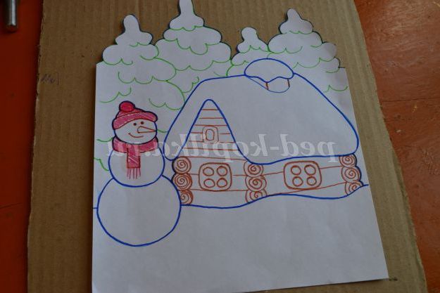 Перше, що ми робимо, це малюємо сюжет для майбутнього панно. (Ця картинка буде одночасно трафаретом для аплікації). Тематика у нас зимова, значить, і сюжет буде зимовим. Це, звичайно ж, засніжений ліс, снігу на ялинках так багато, що вони здаються важкими, а на краю лісу стоїть дерев'яна хатинка, в якій світяться віконця. Хто ж живе в цій хатинці? Напевно той, хто зліпив зі снігу забавного сніговика і подарував йому шапочку і шарфик.