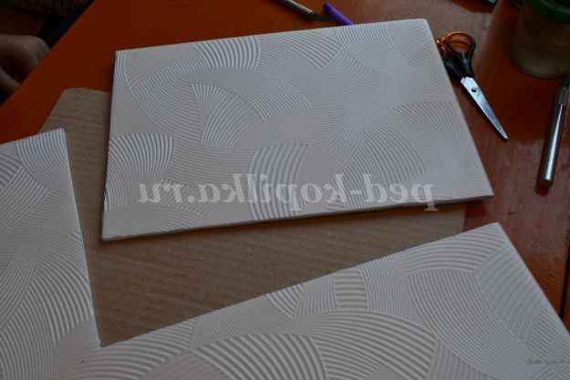 Тепер, коли сюжет готовий, вирізаємо основу панно. Для цього ми просто прикладаємо нашу картинку-трафарет на кут плитки і вимальовуємо ручкою дві сторони (малювати потрібно саме ручкою, так як вона залишає чіткий, добре видимий слід).